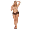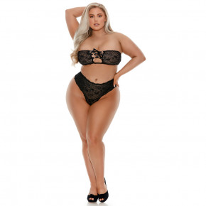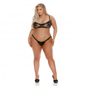 Deze stijlvolle grote maten bh en slip set heeft een sexy bandje onder de bh en heeft een kousenbandstijl bij de billen met dijbandjes die verwijzen naar een kouslook.