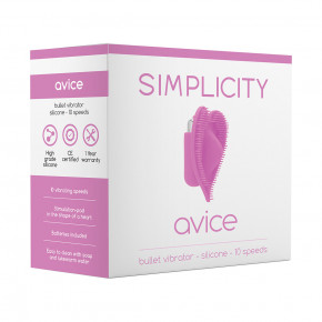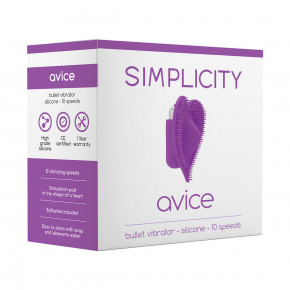 De Simplicity Avice is een clitoris stimulator in de passionele kleur paars. Hij is voorzien van een verwijderbare bullet die je verwent met 10 verschillende standen. Deze stimulator verwent niet alleen de clitoris maar ook de omliggende gevoelige plekjes zoals de schaamlippen.